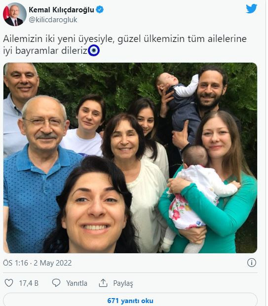 Cumhuriyet Halk Partisi Genel Başkanı Kemal Kılıçdaroğlu: Ailemizin iki yeni üyesiyle, güzel ülkemizin tüm ailelerine iyi bayramlar dileriz.