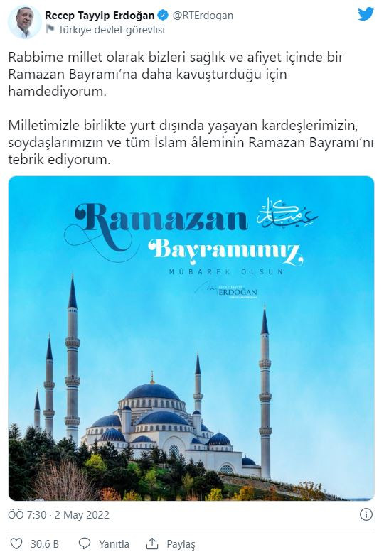 AKP''li Cumhurbaşkanı Recep Tayyip Erdoğan: Rabbime millet olarak bizleri sağlık ve afiyet içinde bir Ramazan Bayramı’na daha kavuşturduğu için hamdediyorum. Milletimizle birlikte yurt dışında yaşayan kardeşlerimizin, soydaşlarımızın ve tüm İslam âleminin Ramazan Bayramı’nı tebrik ediyorum.